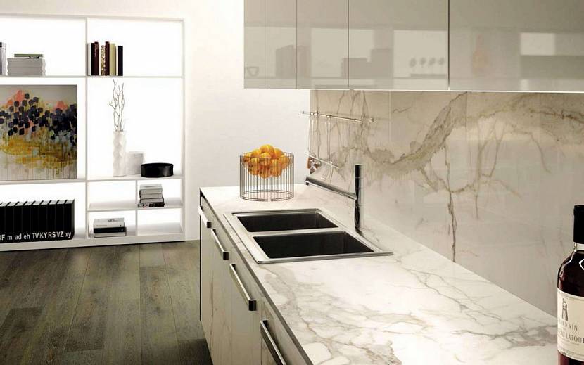 Чаще данный материал используется в белом цвете для облицовки фартука кухонного пространства. Имитация получается довольно точной. На плитке имеется хаотичный рисунок, как в настоящем природном материале.