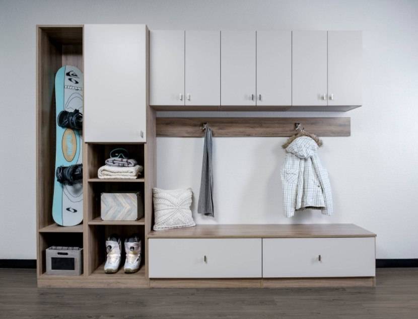 В совсем маленьком и узком помещении лучше обойтись открытой вешалкой, закрытыми тумбами внизу и полкой для головных уборов вверху. Тумбы одновременно могут служить сиденьем.