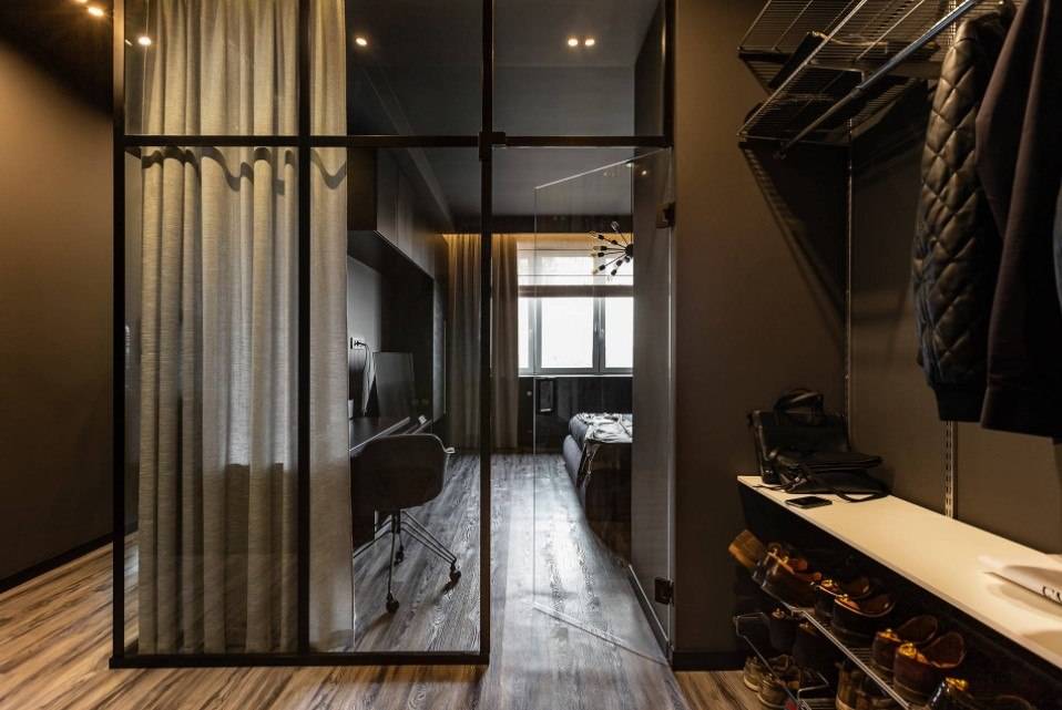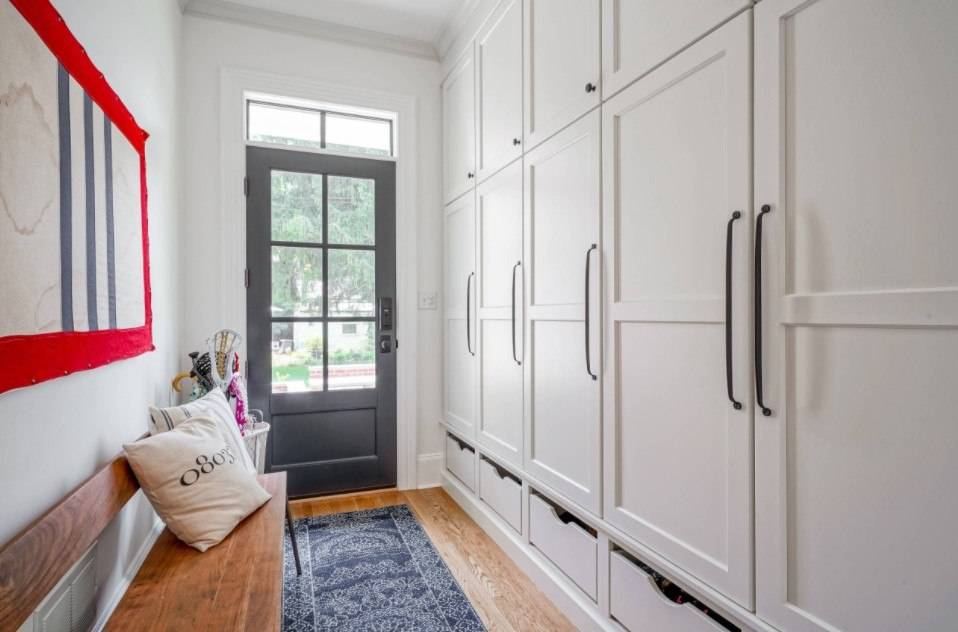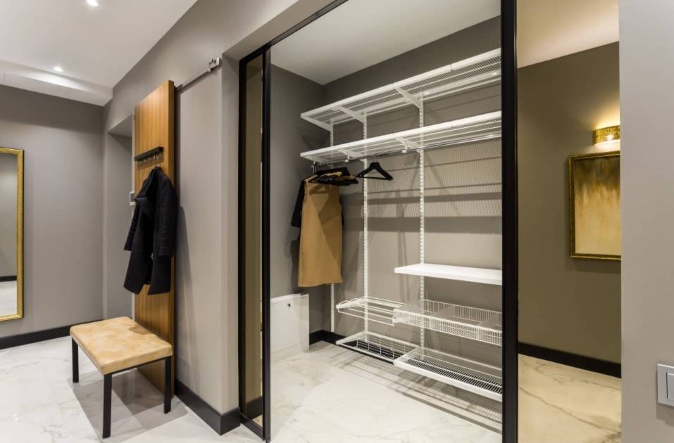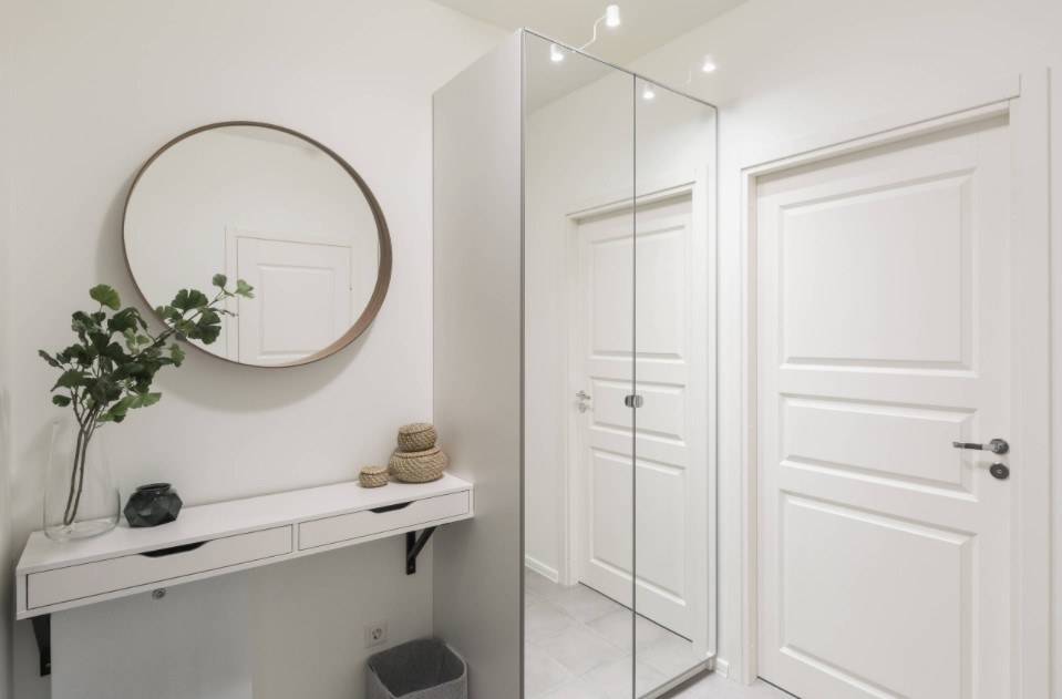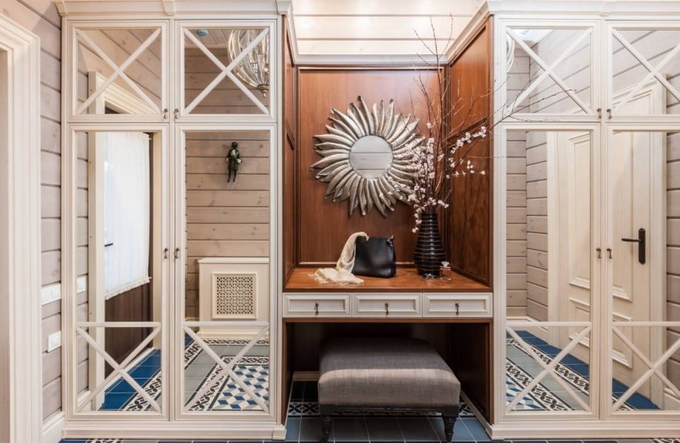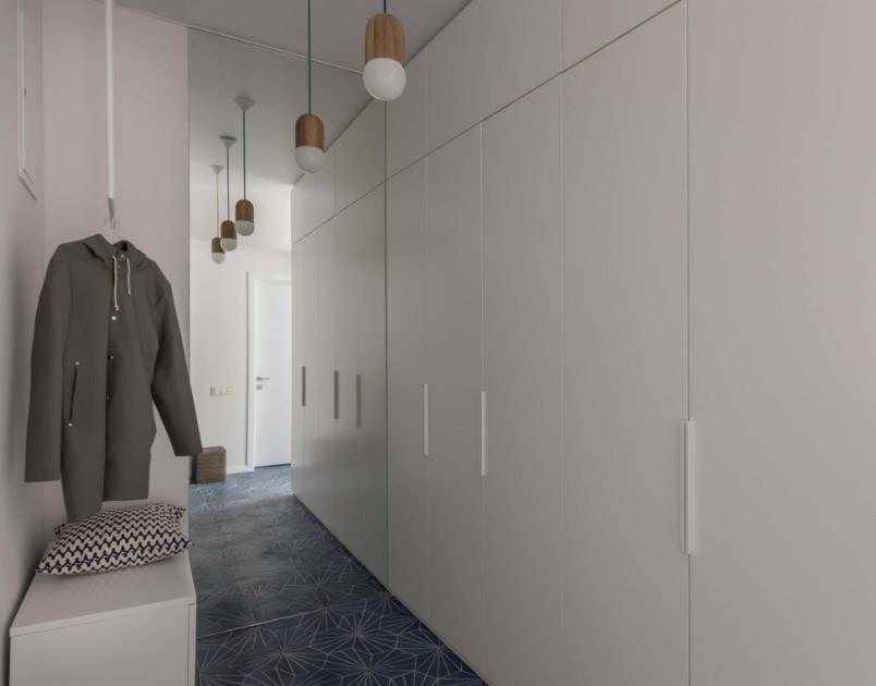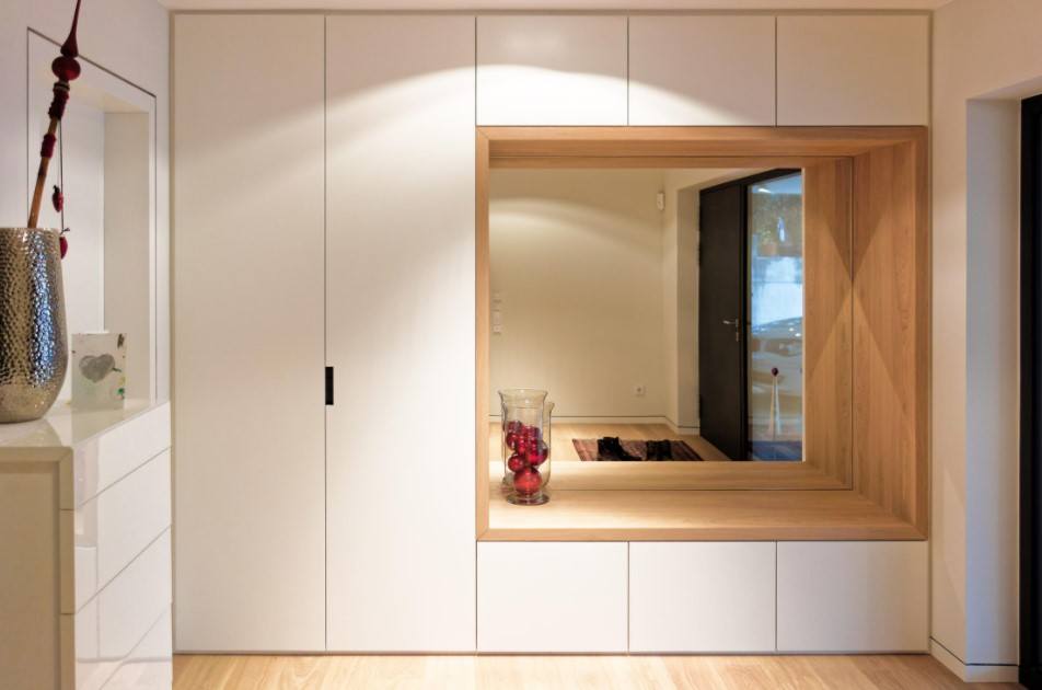 Если углы создают очень сильное негативное настроение, правильнее всего смягчать их визуально за счет шкафа купейного формата, способного еще и разместить верхнюю одежду всей семьи.