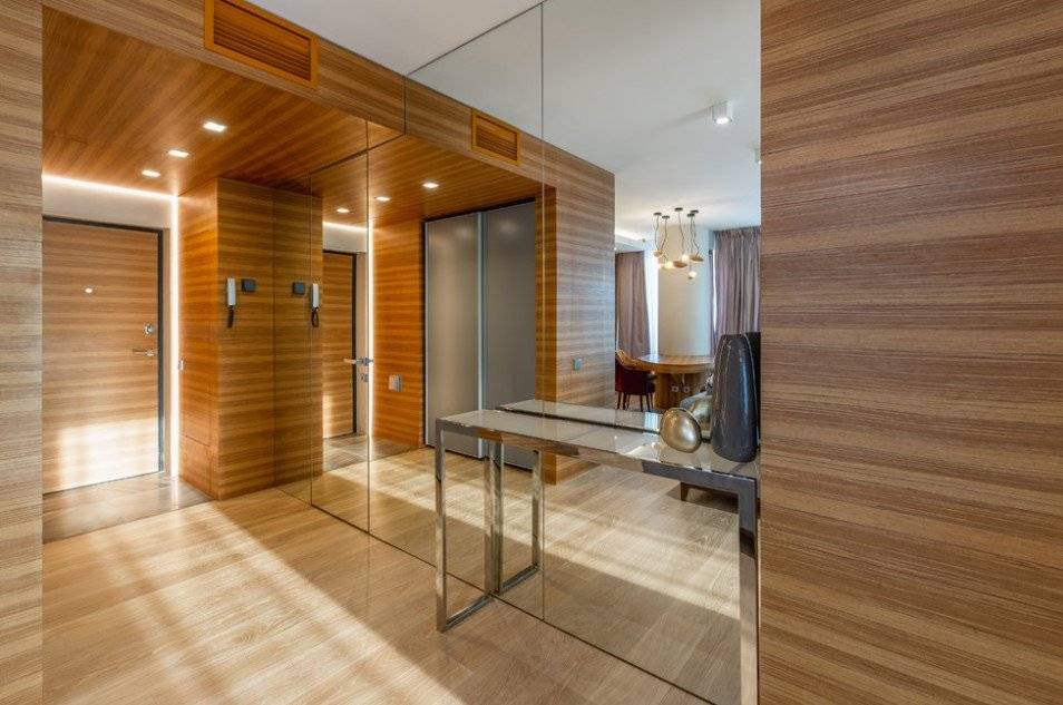 Проблему узкой прихожей можно с помощью глянцевых зеркальных обоев