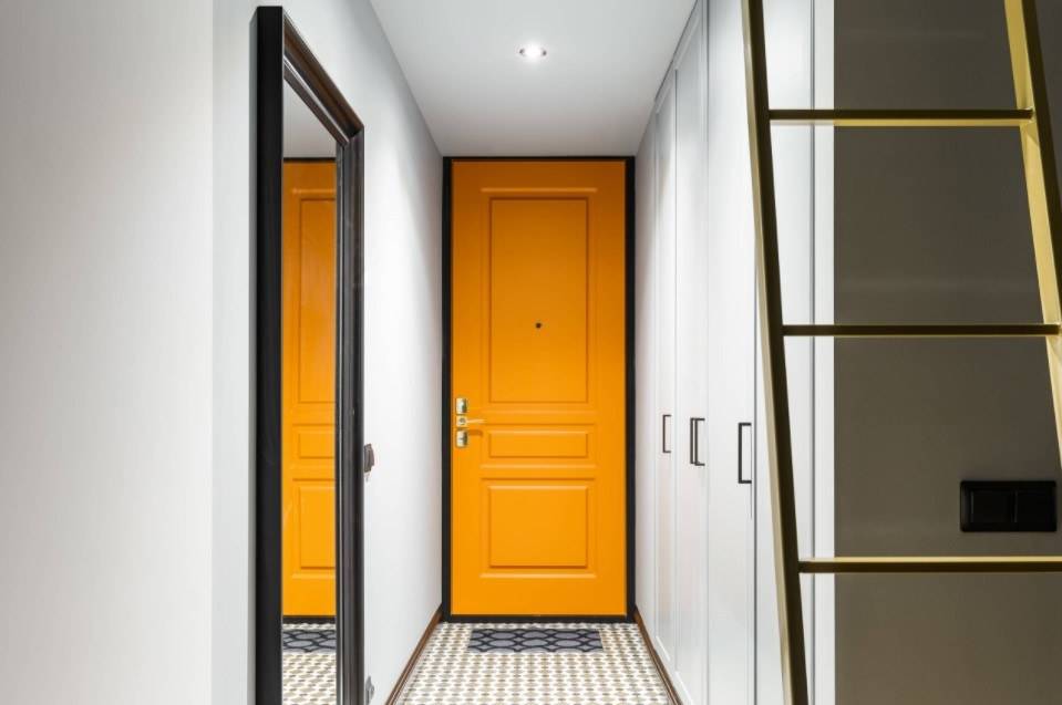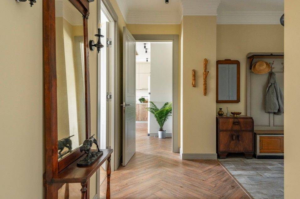 • В большом коридоре можно использовать более теплую гамму. К ней относятся красный, оранжевый, кофейный, кремовый, желтый, абрикосовый цвета. Они будут делать помещение уютным и визуально привлекательным.