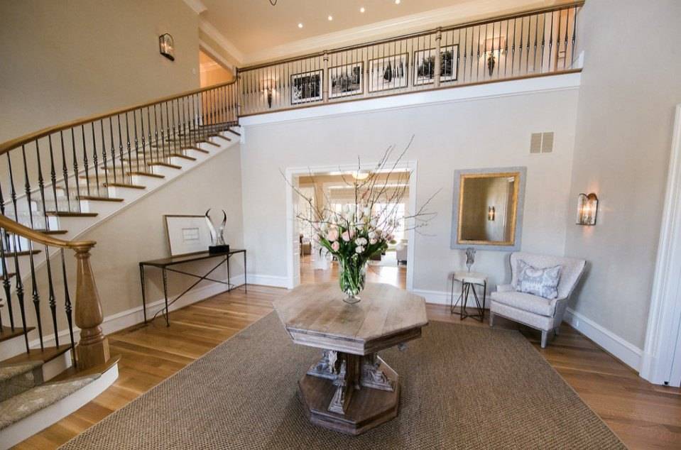 На фото просторная прихожая и стены, оформленные обоями с рисунками птиц.