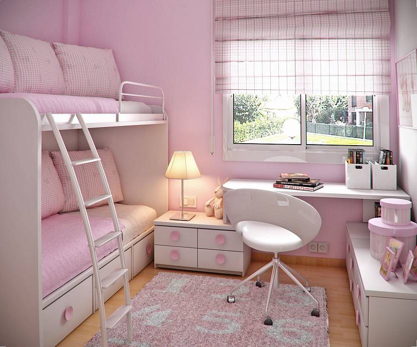 - Нюдовые оттенки. Оформление комнаты для двоих девочек в нюдовых пастельных тонах — классический вариант. Такой интерьер будет актуален даже после взросления сестер. Наиболее популярен среди дошкольниц и школьниц младшей школы дизайн в розовых и фиолетовых тонах. Девочки постарше предпочитают голубой, оливковый или бежевый. Более утонченной считается композиция из бирюзового и фиолетового, или желтого и голубого пастельных оттенков. В качестве третьего цвета можно добавить черный или белый.