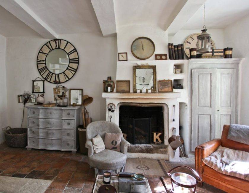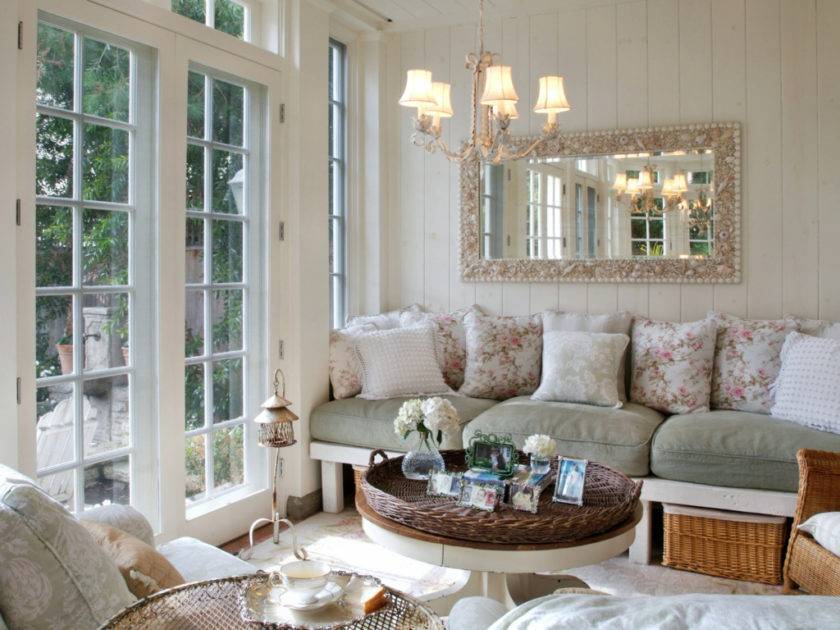 - аксессуары играют важнейшую роль и должны вносить уют и душевность. Используется эмалированная посуда, вязаные салфетки, льняные занавески, цветы, зеркала в простых рамах, присутствует обилие текстиля (ситец, лен, хлопок). Преобладающие рисунки: клетка, полоска, горошек.