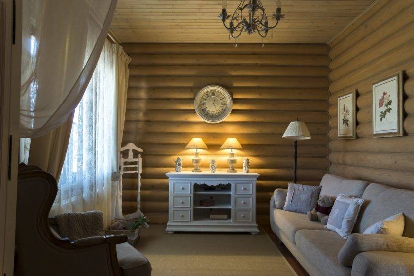 Эффектно будут смотреться оштукатуренные стены с имитацией деревянных балок, а также обитые досками или готовыми панелями. Можно комбинировать вышеперечисленные материалы.