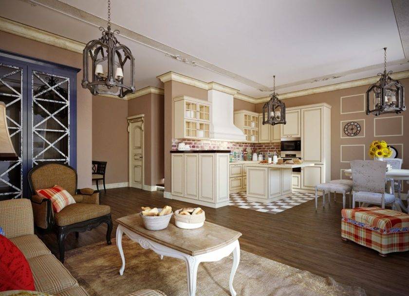 Стилю характерно использование мебели с эффектом состаренности, а так же кованых элементов. Цветовое оформление в пастельных тонам. Основной материал в интерьере кухни – дерево.