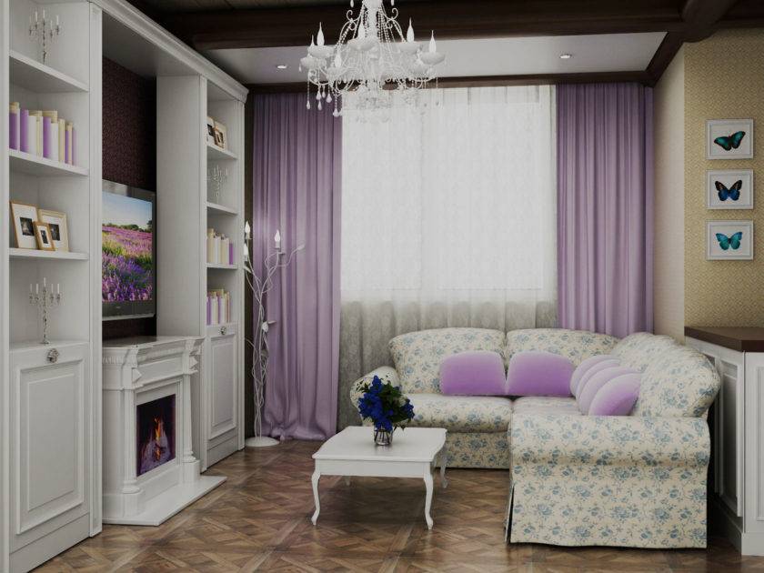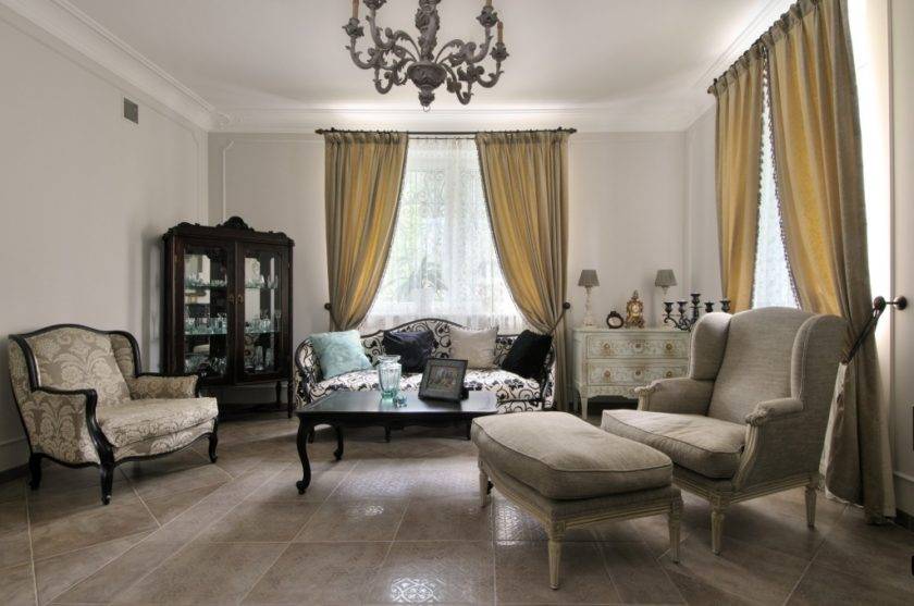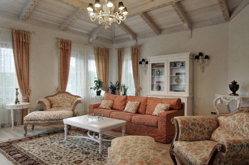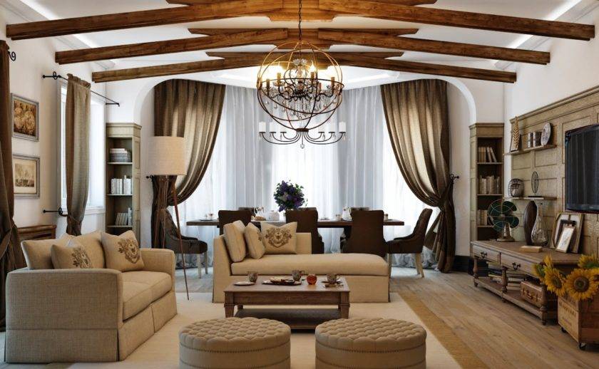 Для гостиной предпочтителен толстый мягкий шерстяной ковер, а диван и кресла можно украсить небольшими подушками. Лучше выбрать светлую цветовую гамму. Темные шторы, не пропускающие света, не вписываются в такой интерьер. Основным элементом просторной комнаты может стать камин – главная ассоциация с уютом у большинства людей.