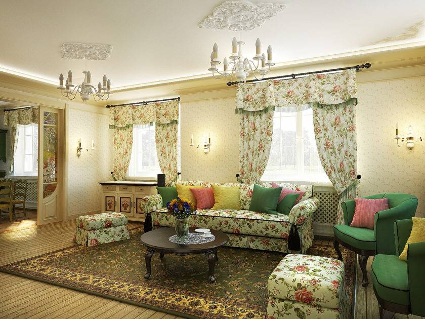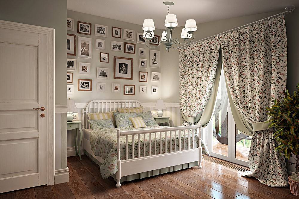 В спальню рекомендуется повесить длинные шторы до пола и сделать красивые подхваты. Кровать застилается покрывалом или пледом в одном цвете со шторами. Отлично подойдет ковер из шерсти или хлопка. В качестве декора спальни хороши разноцветные подушки различных размеров. Добавить уюта и деревенской атмосферы помогут деревянные шкатулки, фарфоровые статуэтки, классические подсвечники и свечи, вазы с полевыми цветами.