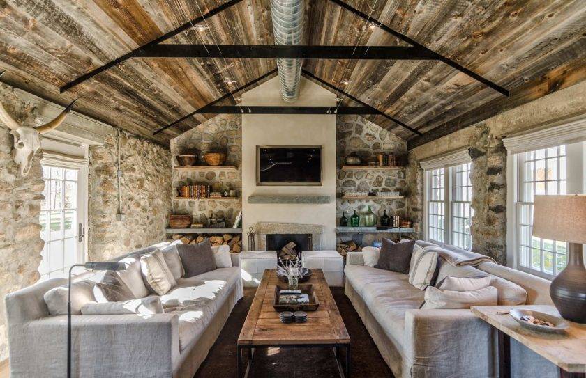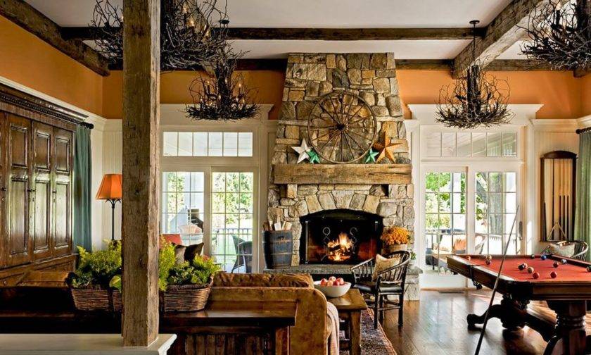 - для отделки используют только натуральные материалы. Пол выполняют из дерева или камня, стены штукатурят, красят или облицовывают камнем около камина, потолок оставляют окрашенным или оштукатуренным, часто его украшают деревянными балками;