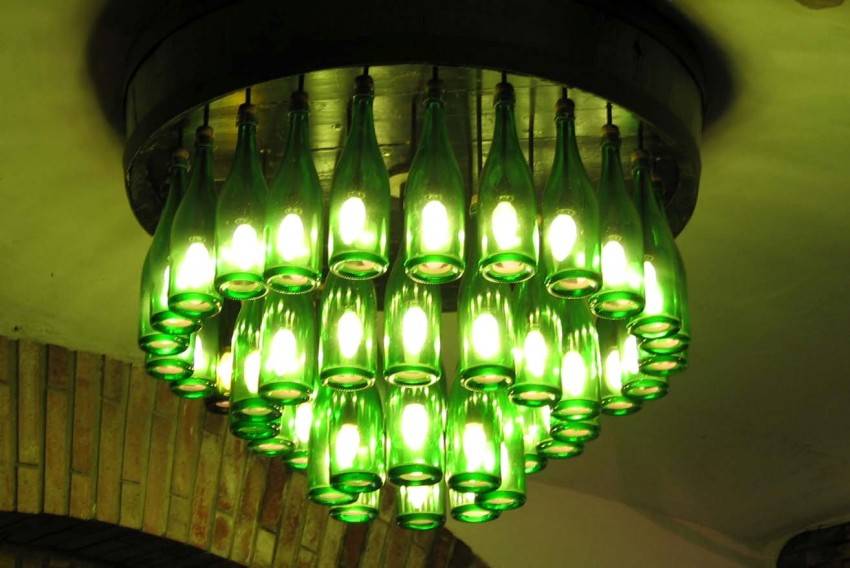 Хорошо смотрится гофрированная декоративная бумага. Используются пластиковые бутылки и ложки, бисер. Любителям пэчворка и декупажа открываются горизонты практического применения этих техник. На фото представлены лампы сделанные своими руками.