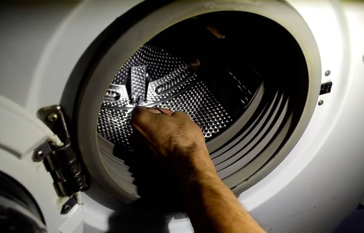 Для того чтобы выполнить работы требуется вооружиться фонариком и обследовать барабан изнутри. Надо внимательно проводить осмотр, чтобы не пропустить наличие предмета в барабане и не пойти по ложному пути при ремонтных работах.