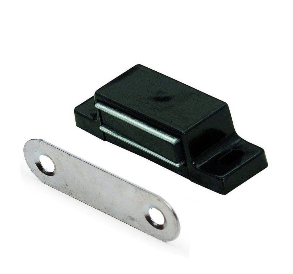 - Мебельная магнитная защёлка. Устанавливается как мебельная фурнитура. Монтируются они на виду в проёме или скрытым способом. Имеют небольшую силу притяжения. Размыкаются лёгким движением руки.