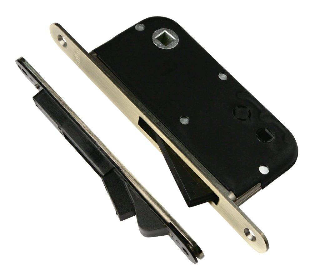 - Врезной пассивный замок с магнитным ригелем размыкаемый поворотом рукоятки. Монтируется данная конструкция в межкомнатных дверях, кухонной двери, в двери сантехнических узлов. Язычок входит в углубление ответной планки с магнитом. Не применяется для входных дверей. Имеет для этих целей простую конструкцию с низкой степенью защиты.