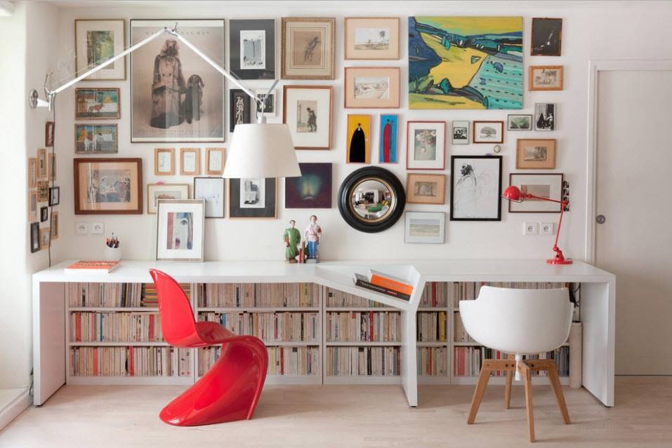 - Вытянутый прямоугольный стол, расположенный вдоль одной из стен, подойдет для двух школьников, если они не мешают друг другу, а половина каждого из них отделена с помощью надстроенного стеллажа или полочки.