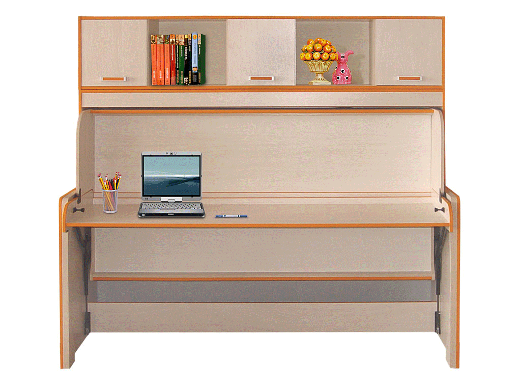 - «стол-вверх»: в этом случае спальное место на ночь опускается вниз, а стол оказывается на уровне пола. Утром стол поднимается вверх – для этого достаточно потянуть кровать за боковину и задвинуть ее в нишу. Главным плюсом такого механизма является то, что вещи со стола можно не убирать;