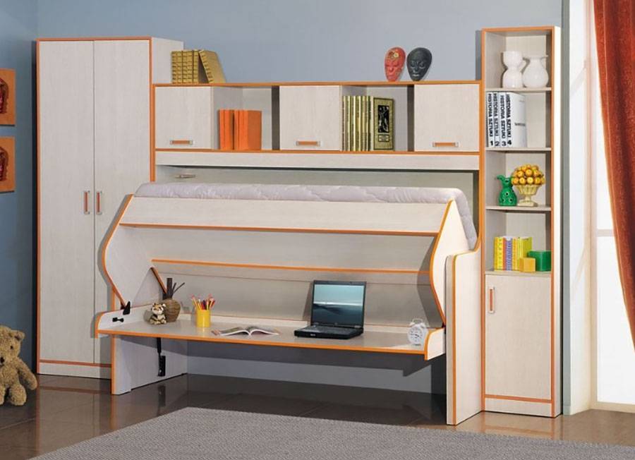 Эту мебель трансформер можно назвать уже стол-кровать-шкаф. Так как более сложные модификации содержат еще секции с полками сбоку. При большой высоте потолка могут быть сверху, выше уровня кровати, сделаны полки с дверками — для хранения редко используемых вещей. Такой вариант пригодится, если у вас нет гардеробной комнаты, в которой хранятся несезонные вещи.
