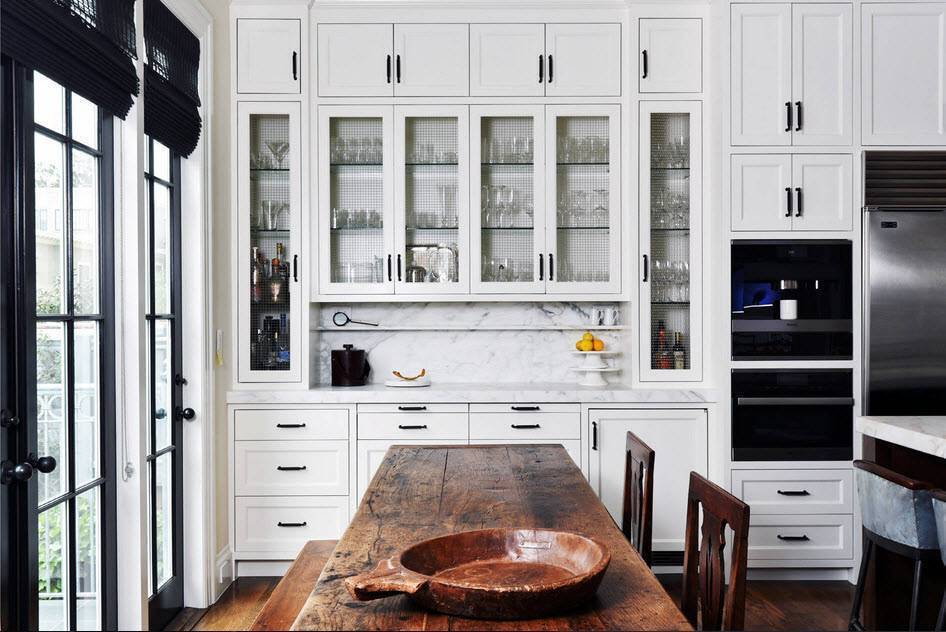 - Посуда, которая используется часто, должна быть всегда под рукой, поэтому внизу ее складывать не рекомендуется. Желательно разместить ее в высокой зоне – 1,5-1,9 метра от пола. Но это касается только крепкой и дешевой посуды – металлических кастрюль, пластиковых тарелок, и т. д. Поэтому стол для хранения не подойдет, используйте для этой цели навесные шкафы.
