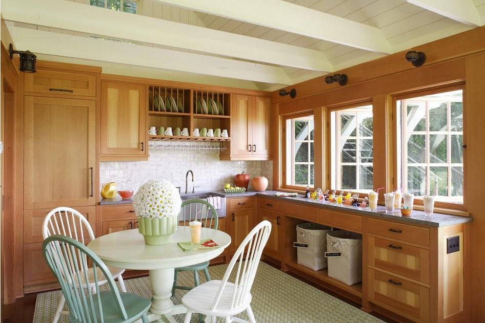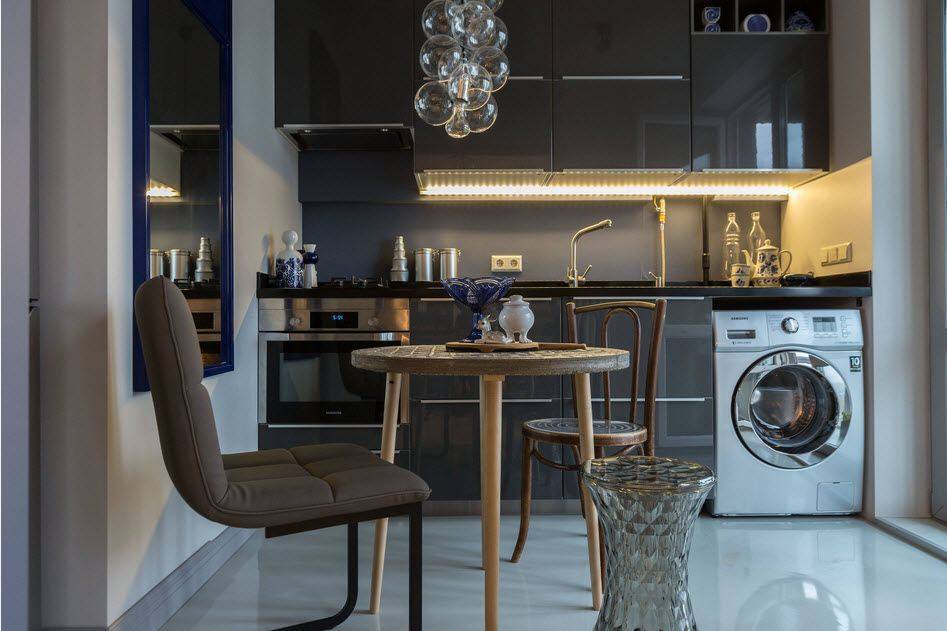 Еще один пример – прямоугольный столик вдоль узкой длинной кухни. Такое размещение характерно для традиционного дизайна столовой, но не менее практично и для маленькой кухни.