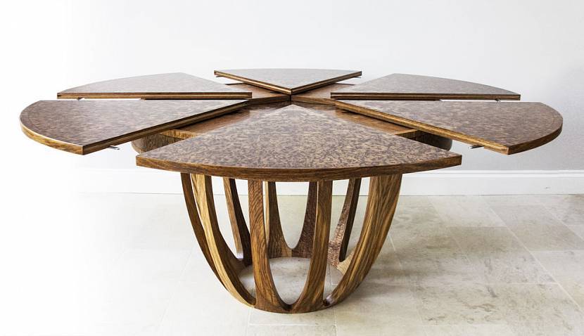 Раздвижной (трансформер). Этот вариант дороже остальных. Столешница состоит из нескольких частей. В собранном виде часть элементов спрятана под внешней поверхностью. Когда стол необходимо увеличить, внешние элементы раздвигаются в стороны, а скрытые поднимаются и заполняют площадь.