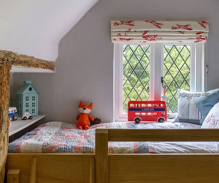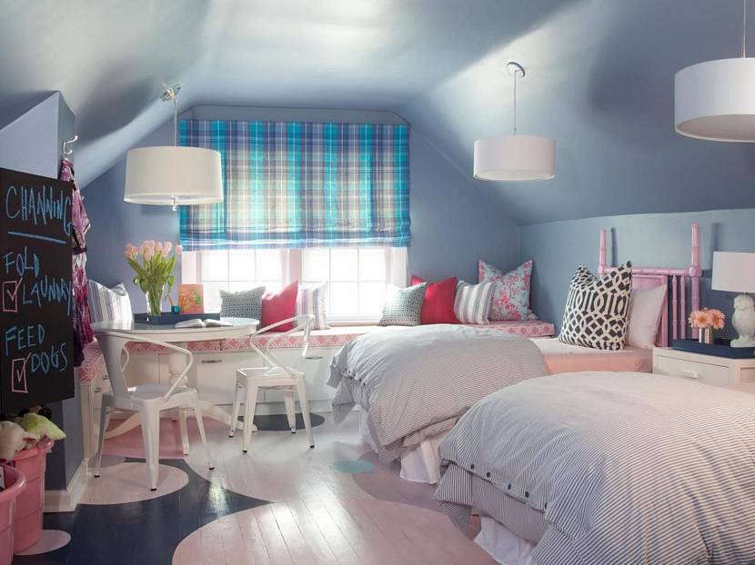 Для декора удобно использовать рулонные шторы. Какой бы вариант вы ни выбрали, главное — соблюсти симметрию. Если детской отведена мансарда, для окон с углом наклона используют жалюзи, рулонные шторы и плиссе.