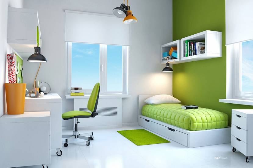Как ни крути, а основным предметом обстановки комнаты остается кровать. Эта мебель для подростка – не только уголок ночного отдыха, но и место посиделок с друзьями. Для удобства и в целях эргономии пространства хорошо выбирать кровати с выдвижными ящиками. Туда ребенок сможет убирать постельное белье и кое-какие вещи. Возле кровати может стоять тумбочка с настольной лампой или ночником. Изящно вписываются в обстановку прикроватные полочки, кстати, они вполне в духе почитаемого минимализма.