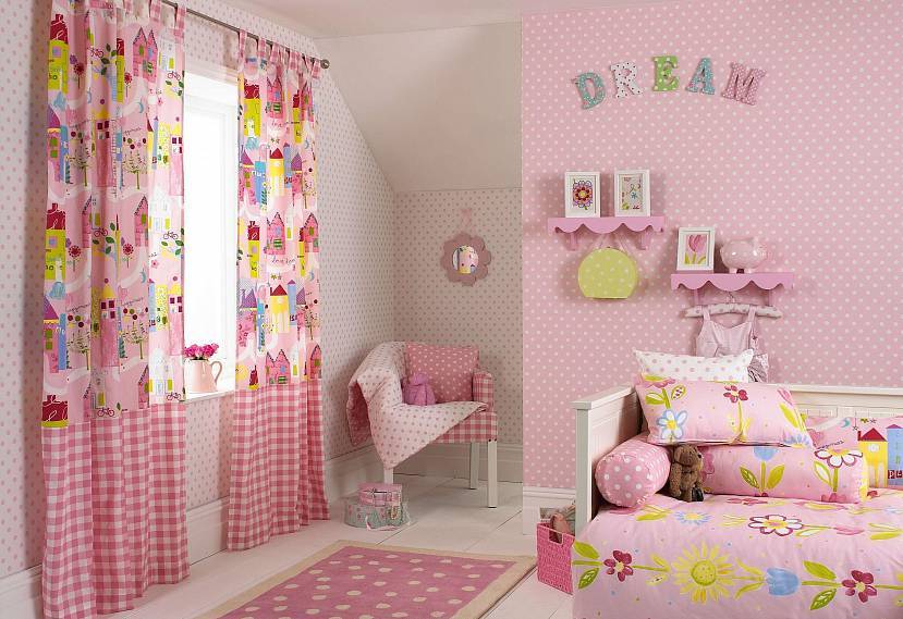 Для маленькой девочки. Подойдут ткани нежных оттенков, не обязательно в розовой гамме. Не обойтись без изображений фей, принцесс, бабочек и единорогов. Очаровательно смотрятся ткани в мелкий горошек, с цветочным принтом, или их комбинация.
