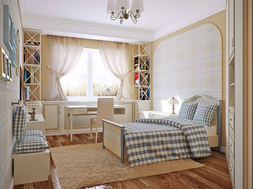 Если подоконник использовать как рабочую поверхность, увеличив его ширину, это сэкономит пространство, спальня будет казаться шире. На противоположной длинной стене ставить широкую мебель нецелесообразно, можно ограничиться стеллажом или навесными полками.
