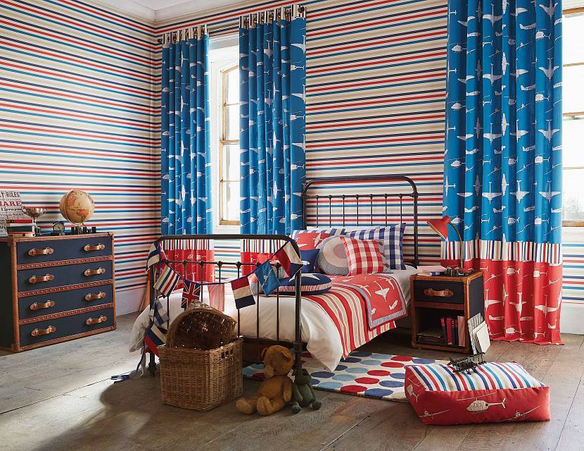 Для маленького мальчика. Ткани с изображением машинок, самолетиков, сказочных героев, или однотонные, но обязательно светлые. Подойдет полоска, клетка или абстракция.