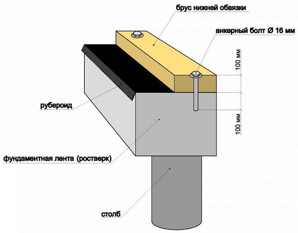 Если после заливки столбов на них будет сооружаться монолитный ростверк, рабочую арматуру выпускают из столбов на высоту этого ростверка. Если же на столбах будет делаться обвязка из деревянных балок, то для её крепления при заливке бетона в верхнюю часть вкладывается резьбовая шпилька (напр., М16).