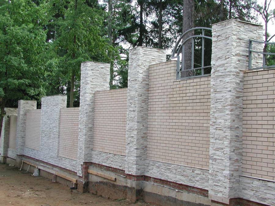 - Декоративный камень с эффектом грубого скола бутового булыжника. В основном это плиты неправильной формы для оформления цоколя и столбов, придающие изгороди монолитный вид.