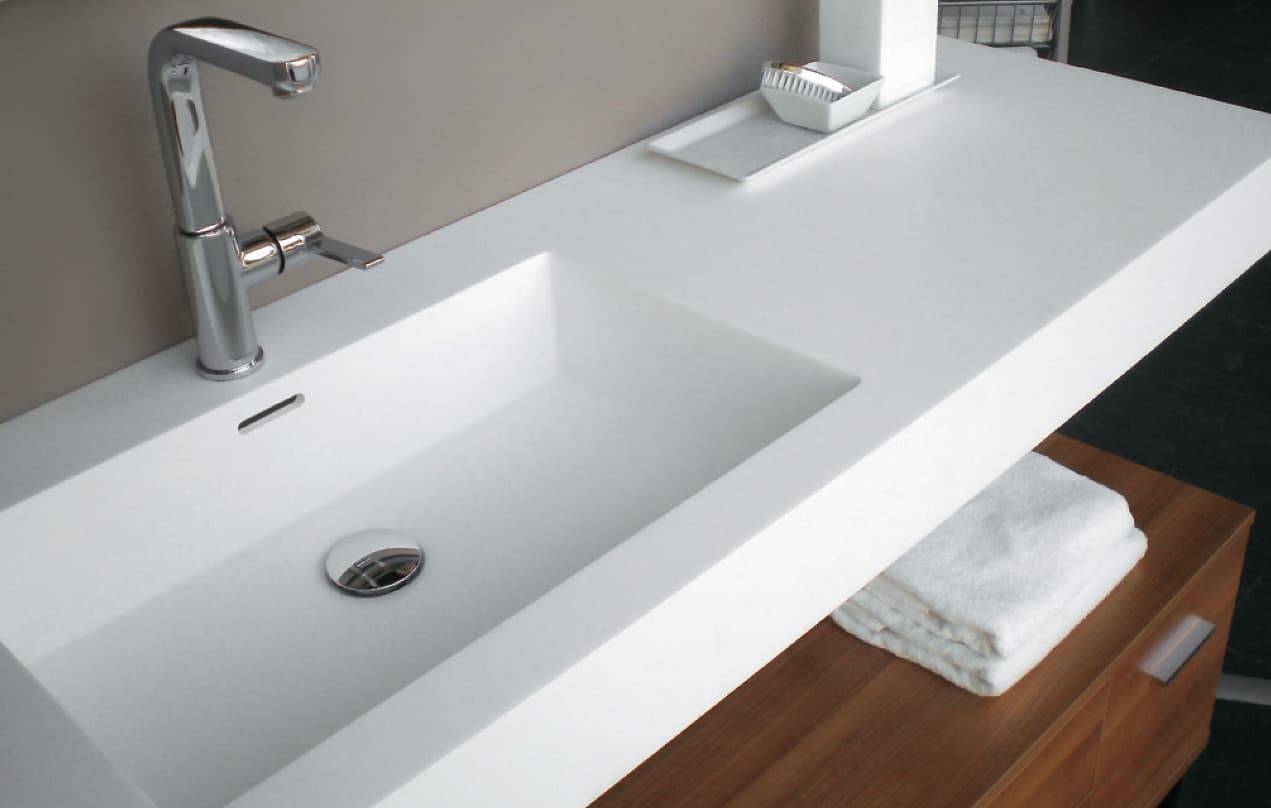 - Столешница и мойка являются единым целым (цельнолитая модель). Выглядит изысканно, исключаются протекания и образование плесени. Недостаток — не всегда удается подобрать нужный размер.