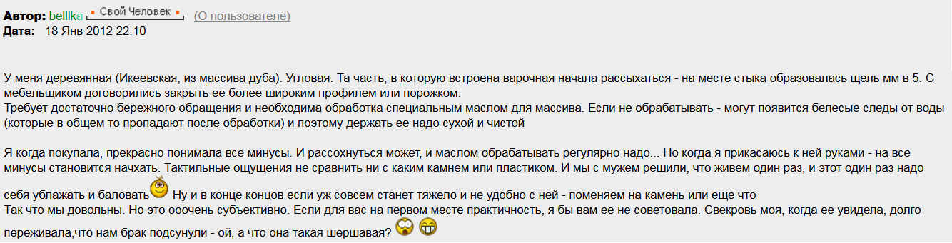 Так что, если вы готовы смирится с некоторыми недостатками, но всё же очень хотите столешницу из массива дерева – берите!