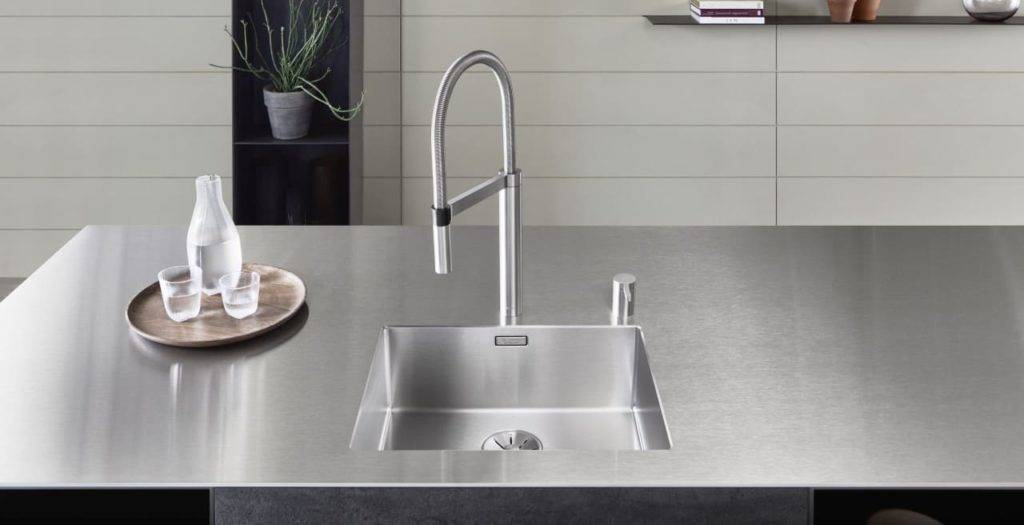 Модели из стали славятся очень высокой прочностью. Поэтому часто их можно увидеть там, где не так важен дизайн, как износостойкость. Например, на кухнях заведений общепита. Но если всё-таки затрагивать тему дизайна, то столешницы из стали здорово смотрятся на кухнях в стиле Хай-тек. В основе таких моделей – ДСП, обтянутый листом стали. При этом нижняя часть, чтобы избежать контакта с водой, закрепляется пластиком. Края отшлифовываются и закрепляются.