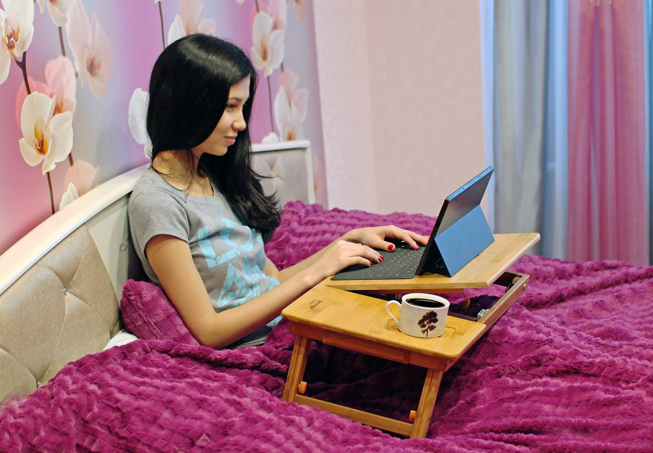 Поднос может быть использован в качестве переносного столика для ноутбука, на него можно положить тетрадку и что-то записать по работе. Все это позволяет человеку ощущать еще большее удобство и решать ряд рабочих задач, находясь в кровати.