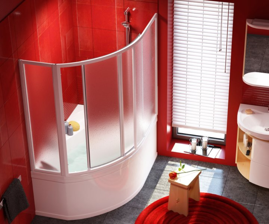 Такой тип стеклянных занавесок напоминает ширму или гармошку. Они состоят из нескольких секций, стекла помещены в специальные рамы, а двигаются они также, как и раздвижные – с помощью удобного роликового механизма. Они также могут складываться или только в одну сторону, или в обе стороны. Такие шторки подходят под любую ванную, любых размеров.