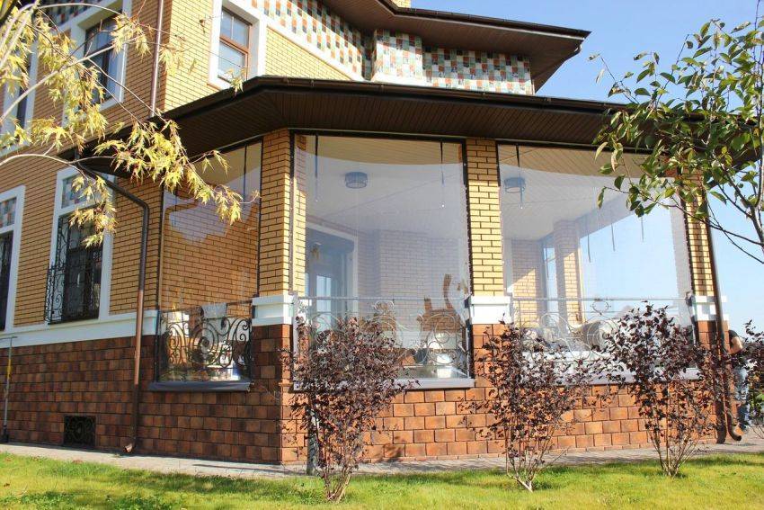 Веранда оснащена прозрачными комбинированными шторами. Здесь используются как статический вариант, так и рулонный для входа. Большой выбор различных цветов, в которых могут быть выполнены спаечные швы, позволили хозяевам подобрать оптимальный вариант для оформления своей террасы. К тому же шторы из ПВХ разнообразны по форме и их можно подобрать под любую форму окна.