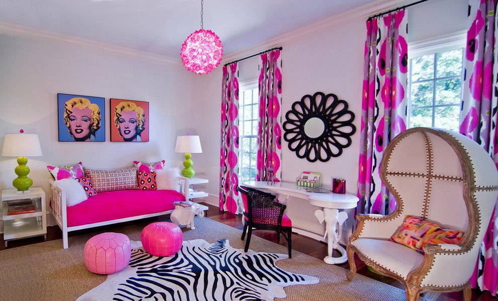Яркие занавески в стиле поп-арта в комнате девочки школьного возраста