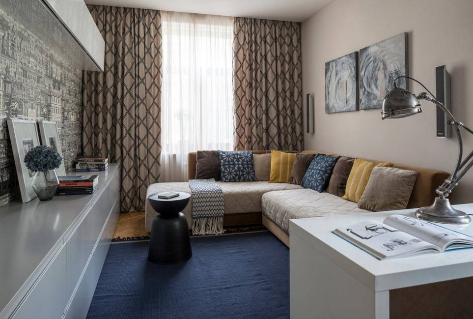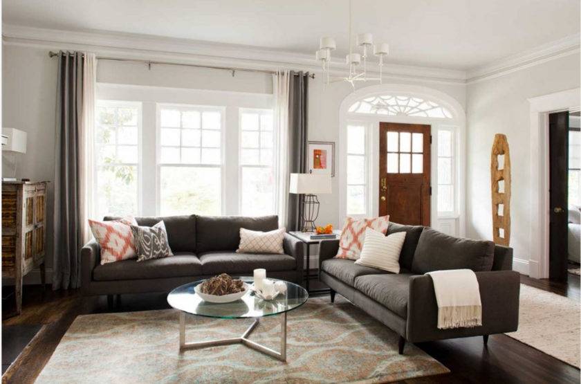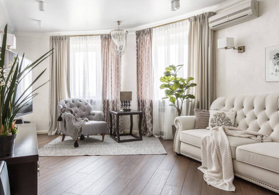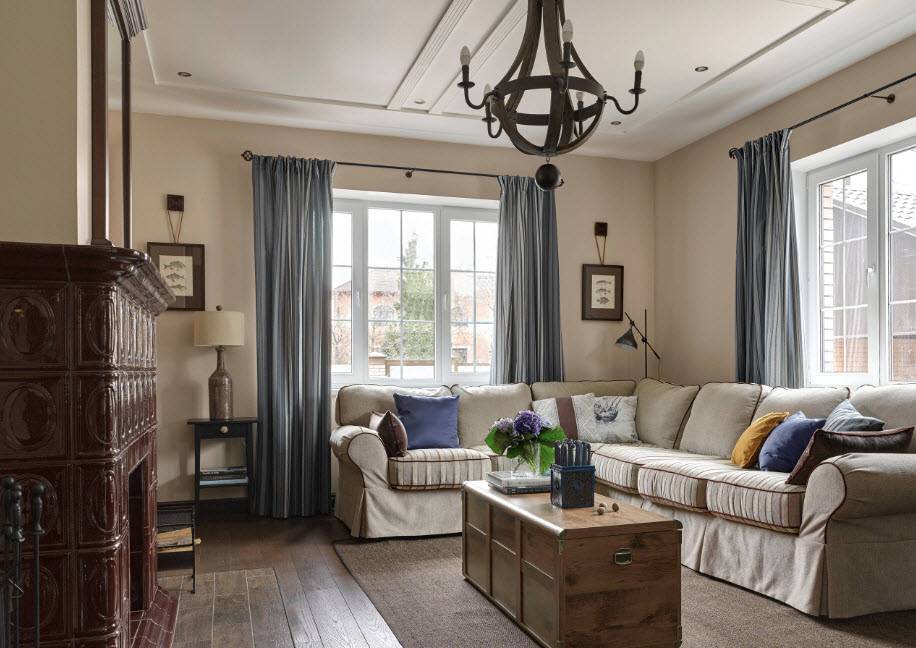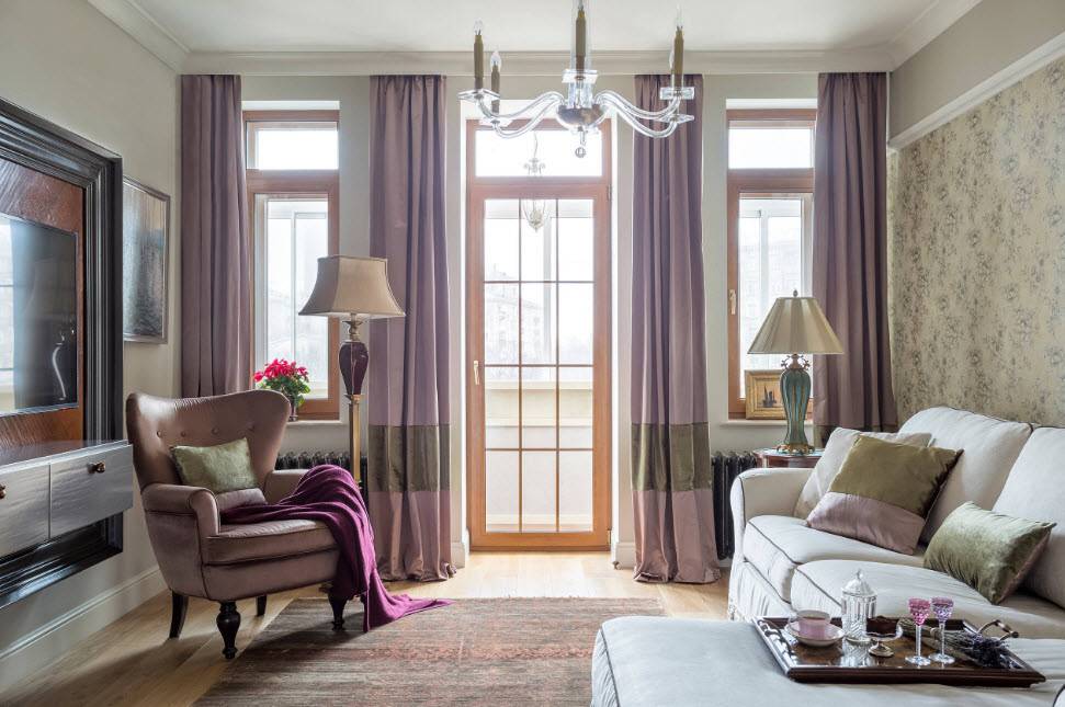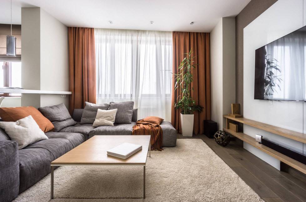 В гостиной, как и в других помещениях, важно, чтобы шторы были короткими и широкими