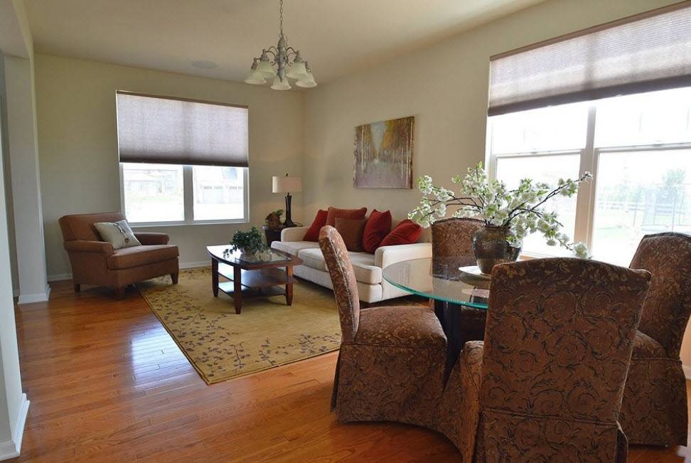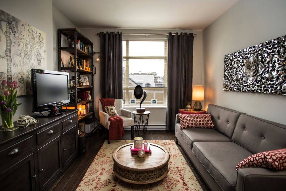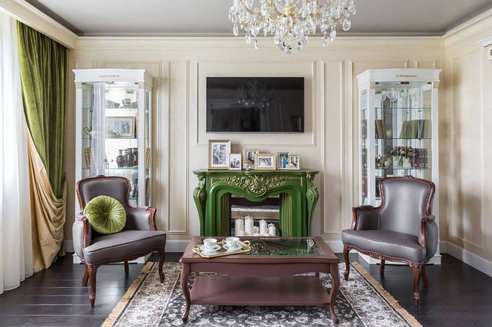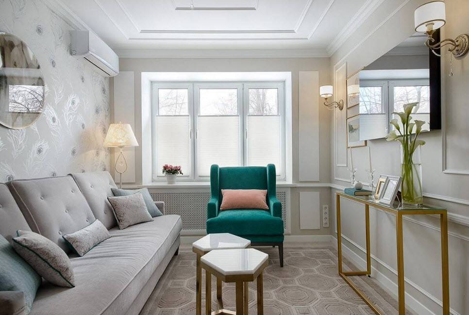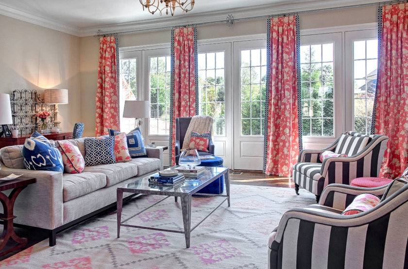 В гостиной, как и в других помещениях, важно, чтобы шторы были короткими и широкими