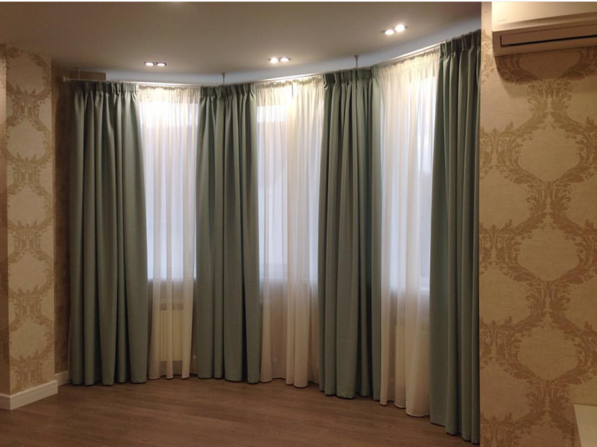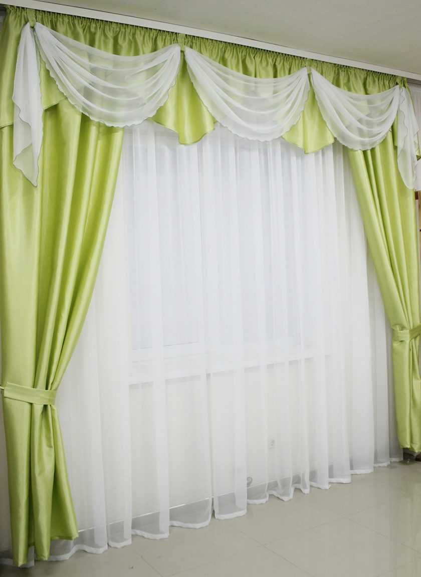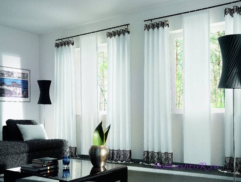 Это актуально в гостиных с большими окнами, где полупрозрачный материал закрывает все окно, а более плотные располагаются по краям и служат для завершения композиции.