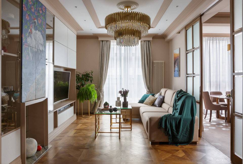 Шторы с ламбрекеном в гостиной красиво маскируют все петли крепления и стену. Они могут быть как классическими, так и римскими. Ламбрекен придает торжественность интерьеру, драпируется кистями и лентами, он может быть однотонным или комбинированным. Сегодня все чаще используют не мягкий, а жесткий каркасный ламбрекен.