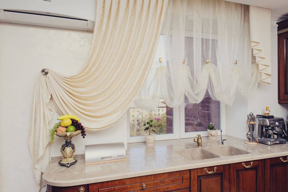 В интерьере объединенной комнаты эффектно смотрятся бежевые шторы. Нежная кремовая гамма поможет создать гармоничный и красивый дизайн. В оформлении окон часто комбинируют сливочные гардины или жалюзи с персиковыми портьерами. Если кухня-столовая в кофейных тонах, то для занавесок можно остановить выбор на цвете слоновой кости.