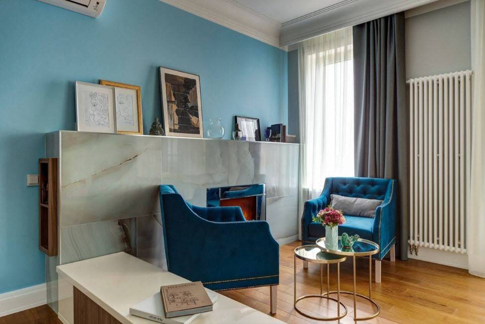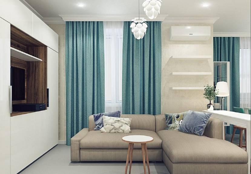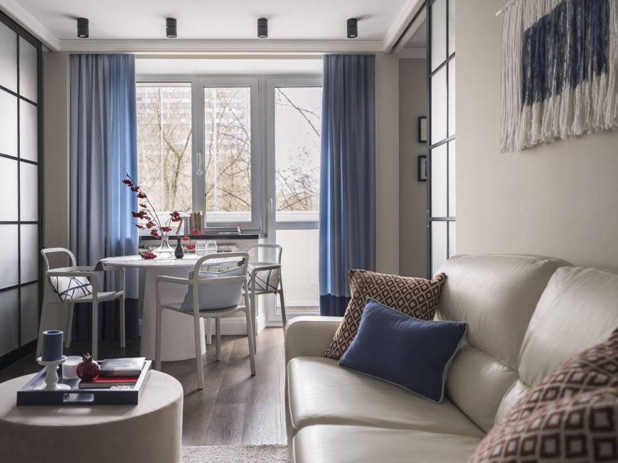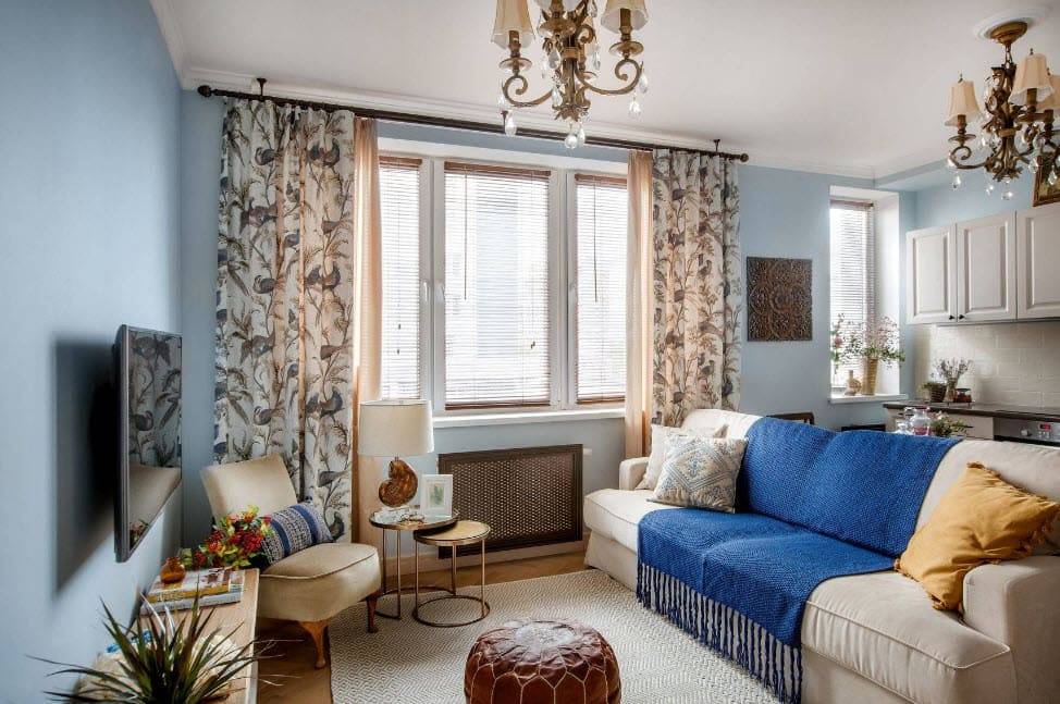 В кухню-гостиную гармонично вписывается синяя гамма. Палитра визуально охлаждает комнату, которая выходит на солнечную сторону. Насыщенные шторы (ультрамарин, кобальтовый, ночной) комбинируют с бежевым оформлением стен и коричневым напольным покрытием. В небольшом пространстве уместен голубой (небесный, морозный).
