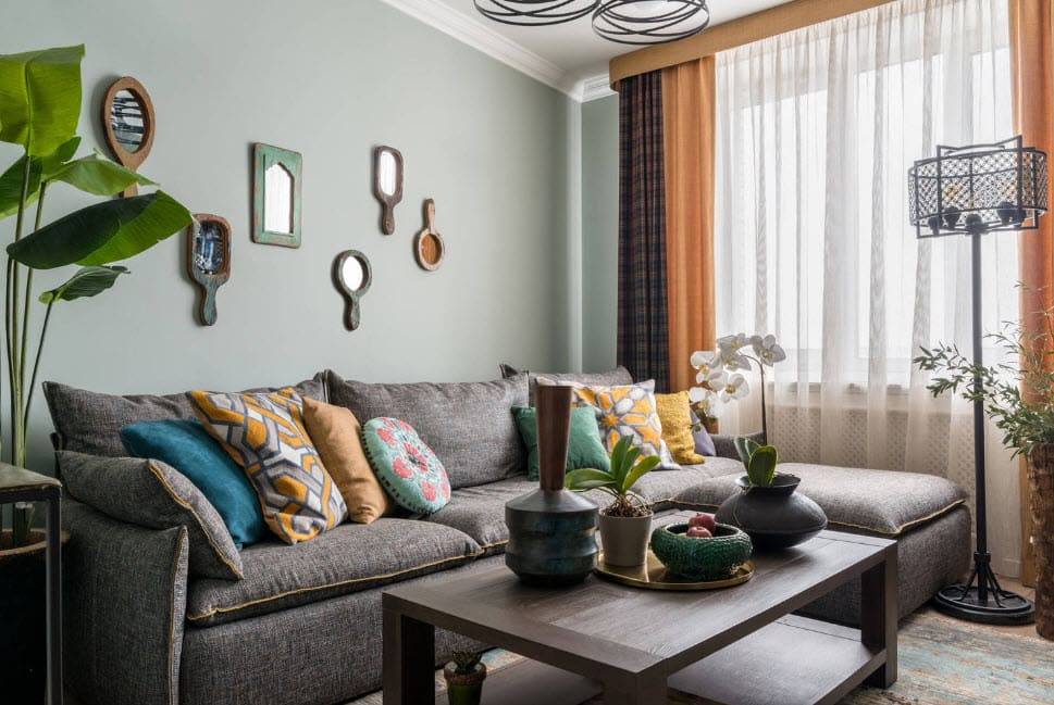 Лучшим решением станут серые шторы, так как это нейтральный оттенок, который хорошо сочетается с любым стилем интерьера. Если это решение кажется скучным, то можно посоветоваться с консультантом в магазине. Всего за пару минут дизайнер создаст трехмерный план помещения с расстановкой цветов, после чего выберет оттенок занавесок, способных дополнить стилевое оформление гостиной