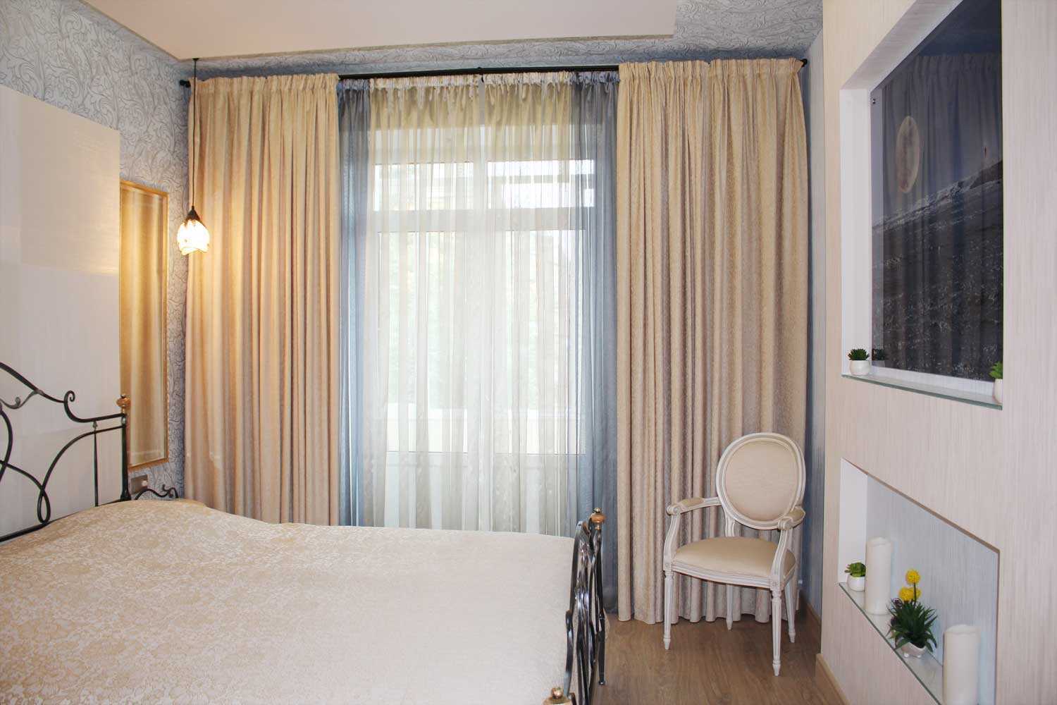 Если игра контрастов и кричащие расцветки способствуют общению и будут в зале как нельзя кстати, то шторы двух цветов в спальне должны быть поспокойнее.