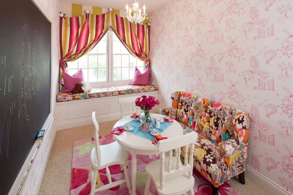 В детскую подбирают шторы, защищающие от яркого света. Чаще всего это сочетание легкой прозрачной вуали с плотными портьерами. Также шторы могут быть с рисунком героев любимых мультфильмов (вариант для самых маленьких). Слишком яркие цвета для занавесок в детской не рекомендуют использовать, так как они будут раздражать нервную систему ребенка, не давая уснуть или просто успокоится.