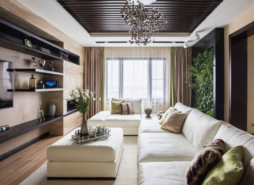 В интерьере гостиной должен ощущаться уют и ощущение праздника, так как это то место, где собираются всей семьей, с друзьями, близкими людьми. Стильный и свежий внешний вид помещению придаст комбинирование светлых и темных тонов. Если позволяет дизайн, можно выбрать черно-белую, желто-зеленую или розово-серую модель. Смотрится такое сочетание элегантно и эффектно