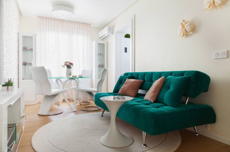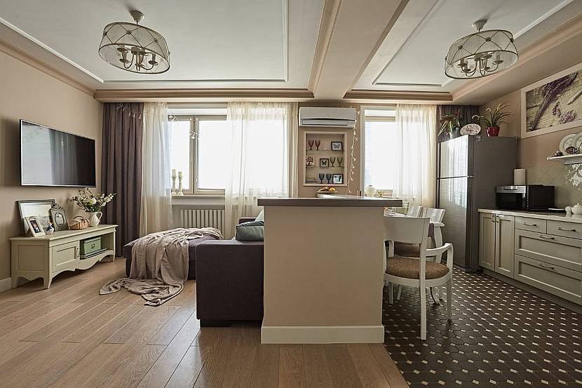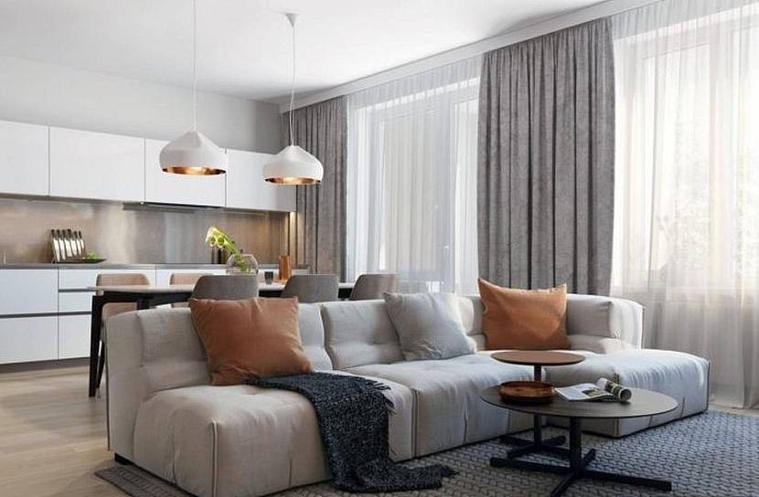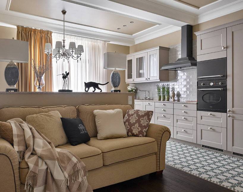 Яркость оттенков тканей на кухне меняется на приглушенные в гостиной. Визуально пространство воспринимается единым, но из-за различия интенсивности создается правильное зонирование. Дизайнеры рекомендуют тона разных функциональных частей повторять в деталях.