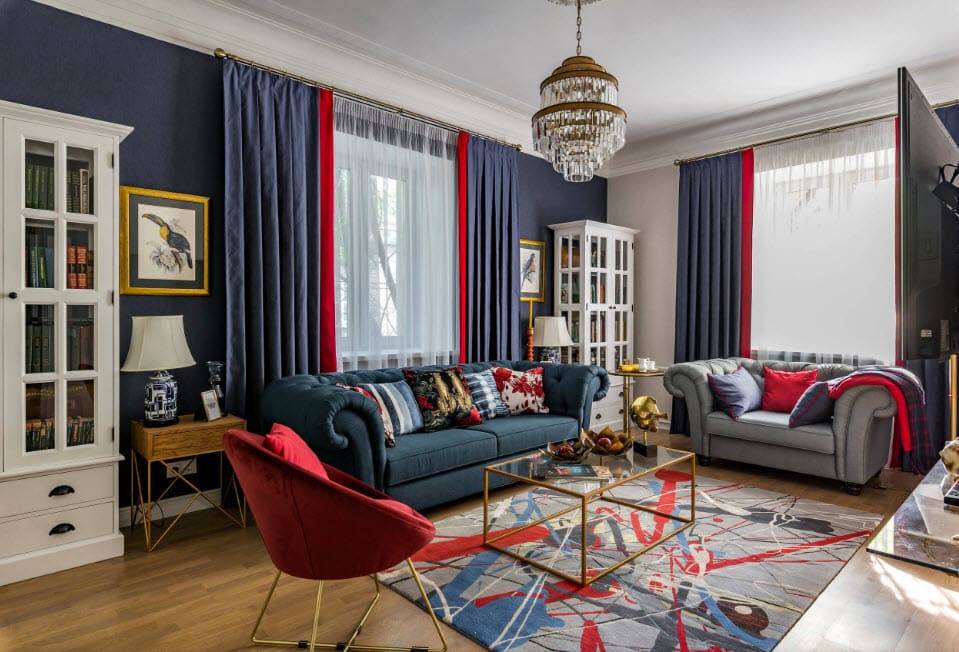 - Контрастные цвета – выбор творческих людей, которые креативно мыслят и принимают неординарные решения. Один из оттенков может стать ярким акцентом, который задает настроение всей комнате.