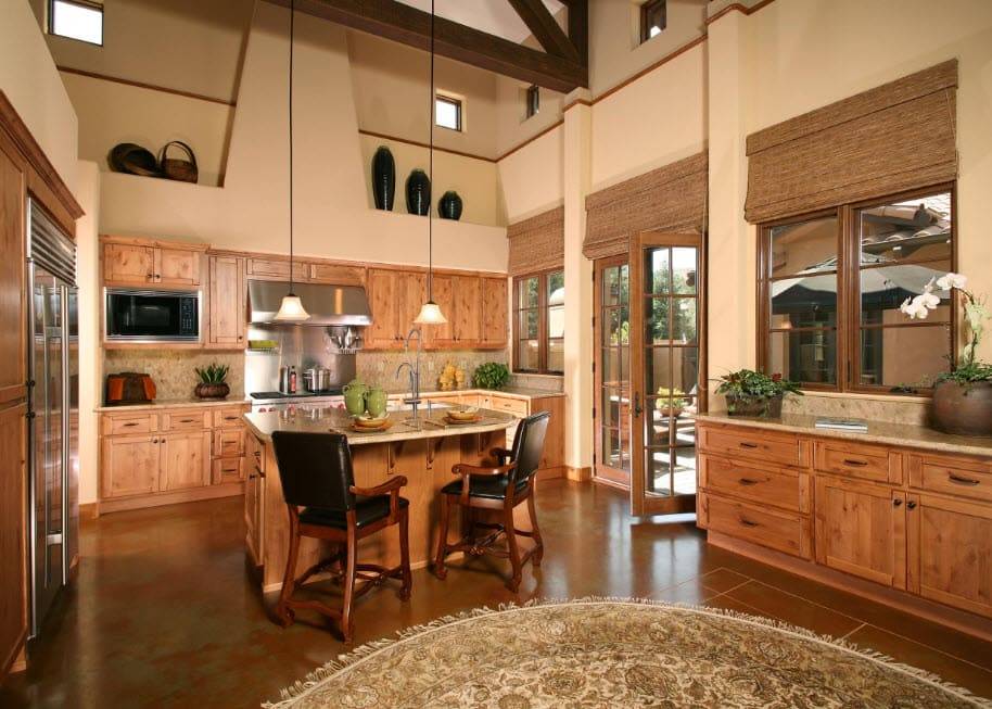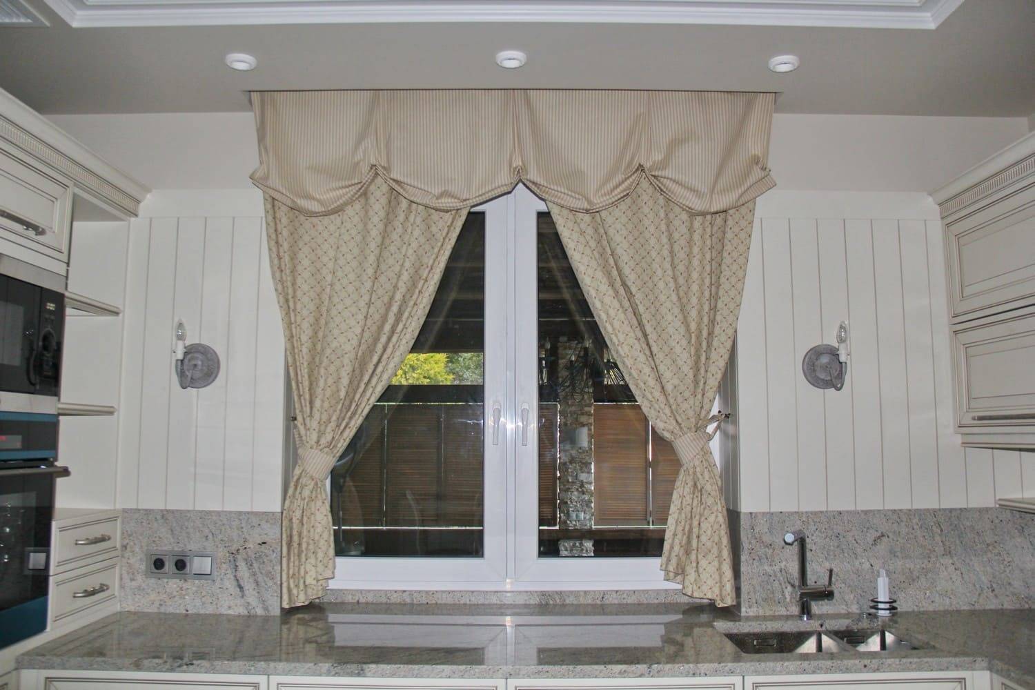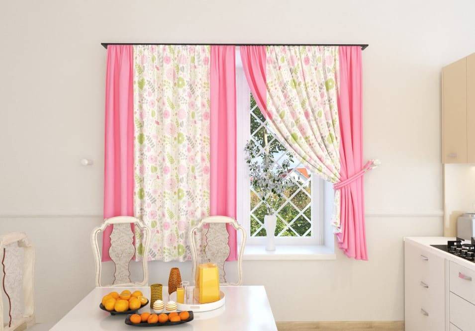 В это помещение выбирают функциональные короткие занавески с антистатическим или пылеотталкивающим покрытием. Лучше всего подходят шторы-кафе, жалюзи, римские или рулонные шторы. Если в кухне готовят редко, лишь делают чай или разогревают еду, то пышная маркиза или небольшой ламбрекен также может быть хорошим вариантом.